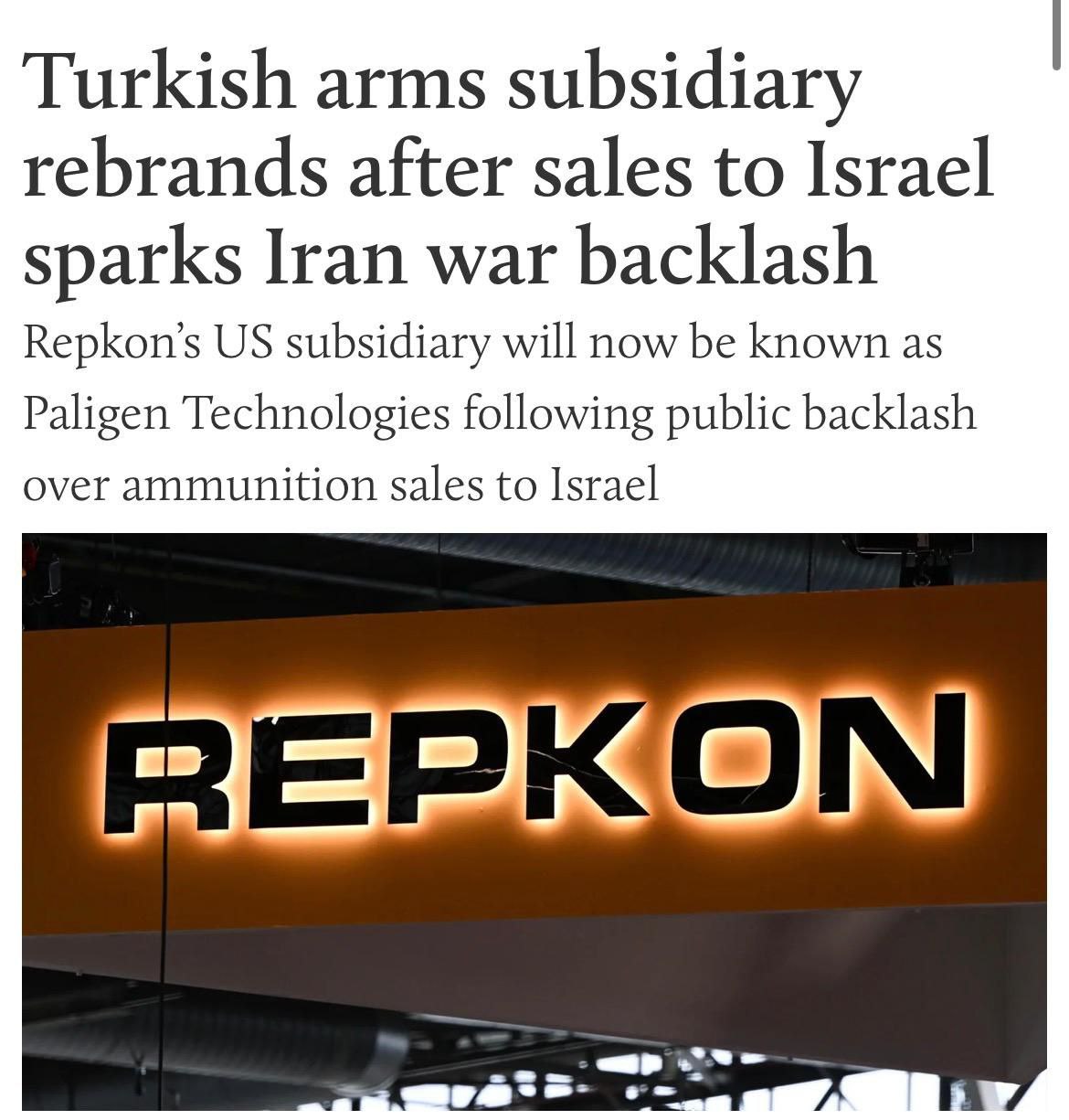 La filiale américaine de la société d'armement turque Repkon USA s'est rebaptisée Paligen Technologies suite aux nombreuses critiques formulées sur les réseaux sociaux concernant la vente de munitions à Israël la Turquie par en pleine guerre contre l'Iran, annonce Middle East Eye (MEE).
