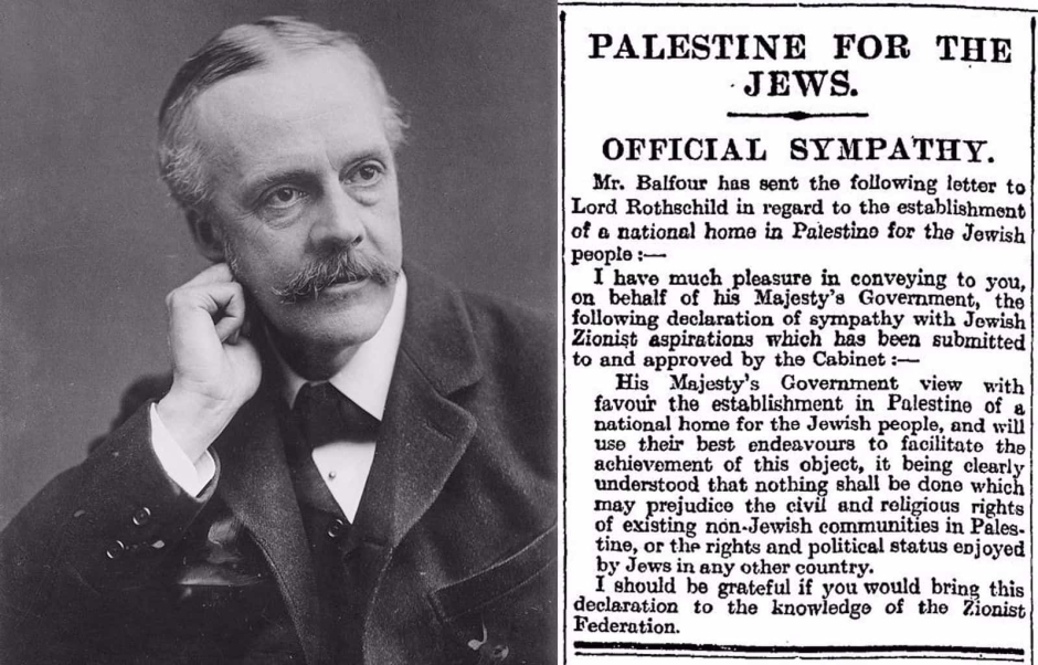 En 1917, Lord Balfour, alors ministre des affaires étrangères du Royaume Uni se permettait de promettre "un foyer national juif" en Palestine, pays qui ne lui appartenait pas.