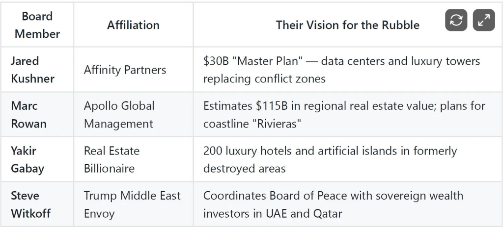 Appliquons maintenant ce modèle à l'Iran. Alors que les bombes américaines détruisent les infrastructures iraniennes, Kushner et le Board of Peace sont déjà en train de vendre des "opportunités d'investissement incroyables" dans un "Iran post-régime" aux fonds souverains de Riyad et d'Abou Dhabi. Un véritable Board of Profits. Marc Rowan, d'Apollo Global Management, estime le potentiel de développement immobilier à 115 milliards de dollars. Le milliardaire et initié Yakir Gabay propose déjà 200 hôtels de luxe et des îles artificielles - construits sur les décombres de ce que les frappes américaines et israéliennes viennent de raser... Avec l'argent de vos impôts.