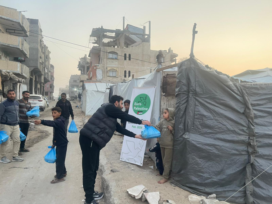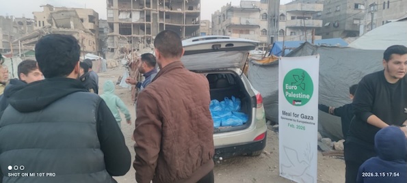 Encore une distribution de riz et de poulet ce dernier dimanche de ramadan aux familles palestiniennes déplacées dans le campement de de Shati, devenu un triste bord de mer où les tentes risquent à chaque moment d'être englouties par la mer, quand les tirs israéliens ne viennent pas terroriser la population.