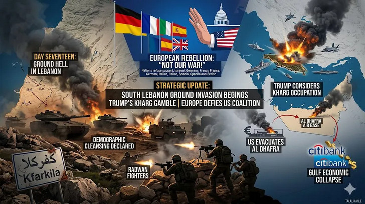 Day Seventeen (2): Israel Begins Ground Invasion to Turn the South into a "Second Gaza".. Trump Considers Occupying "Kharg", and Europe Slaps Him with a Mass Rebellion: "Not Our War!" — Talal Nahle