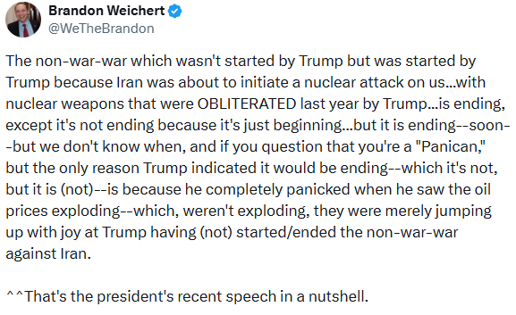 Meanwhile, the Wall Street Journal reported that Iran was now actually exporting more oil today than it had been before the war began, and also allowing through all the tankers carrying oil to its Chinese ally. These were surely great humiliations for Trump.