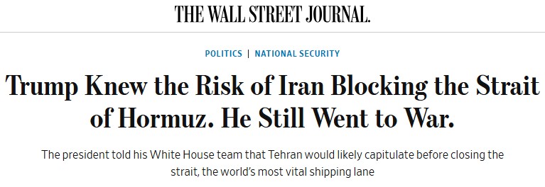 As a major front-page story in the Saturday Wall Street Journal revealed, Trump had been strongly warned about exactly these dangers, but ignored them, feeling confident that he would be able to defeat Iran and force its surrender before any such interdiction of oil shipments became a serious factor.