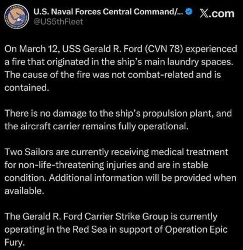 Suite à la confirmation par le CENTCOM d'un incendie à bord de l'USS Gerald R. Ford, actuellement dissimulé au fin fond de la mer Rouge, les autorités ont prétendu que des sous-vêtements avaient pris feu dans la buanderie - ou quelque chose d'aussi rocambolesque- ce qui, si cela s'avérait vrai, ne ferait que renforcer les théories concernant le moral en berne des soldats et les actes de sabotage en cours à bord de ce navire amiral en proie à de nombreux problèmes d'égouts, après la découverte de t-shirts, de serpillières et d'autres objets jetés dans les canalisations.