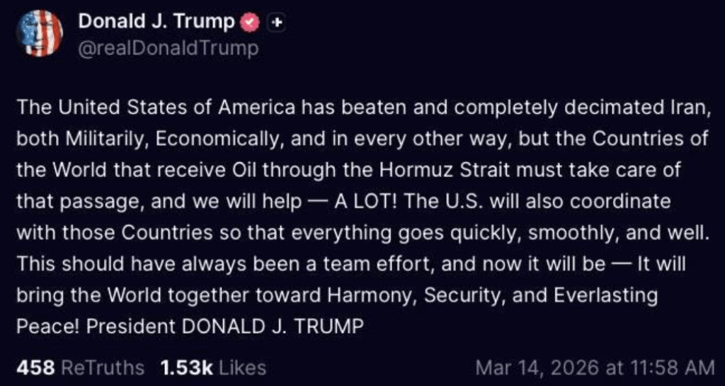 Comme le souligne le commandant de la marine iranienne, Trump supplie désormais ses alliés de débloquer le détroit, les accusant d'en être responsables alors que, Trump prétend que les États-Unis ont miraculeusement "décimé" tout l'Iran.