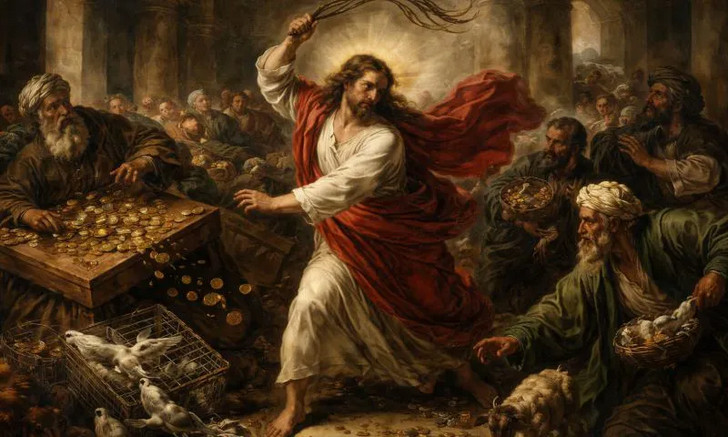 Évangile selon saint Matthieu (21, 12-13) : Jésus entra dans le temple et chassa tous ceux qui y vendaient et y achetaient ; il renversa les tables des changeurs et les sièges de ceux qui vendaient des colombes. Puis il leur dit : "Il est écrit : 'Ma maison sera appelée une maison de prière', mais vous en avez fait une caverne de voleurs".