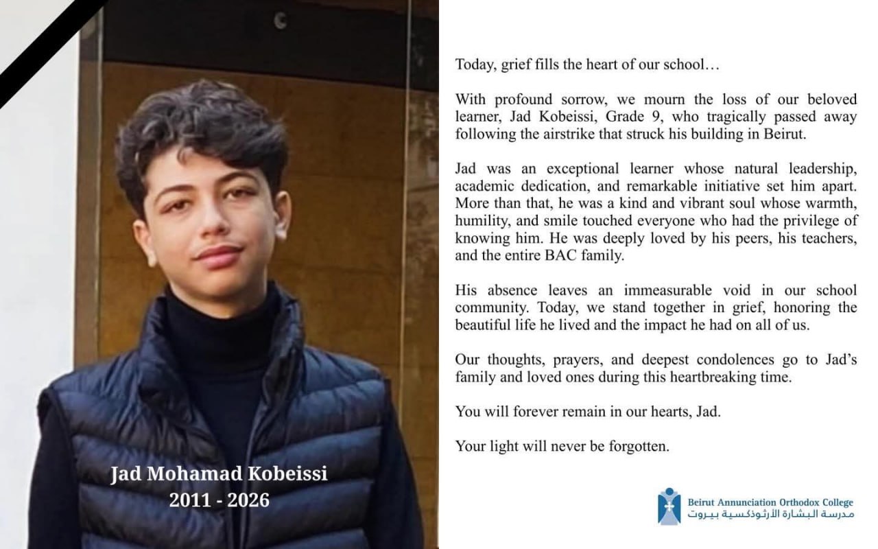Le collège orthodoxe de l'Annonciation de Beyrouth pleure un étudiant exceptionnel, Jad Kobeissi, tué lors du raid aérien israélien sur le quartier de Zoqaq al-Blat à Beyrouth.