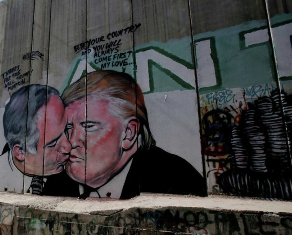 Graffiti de l'artiste de rue Lushsux représentant le président américain Donald Trump embrassant le Premier ministre israélien Benjamin Netanyahu sur le mur entre Bethléem et Jérusalem
