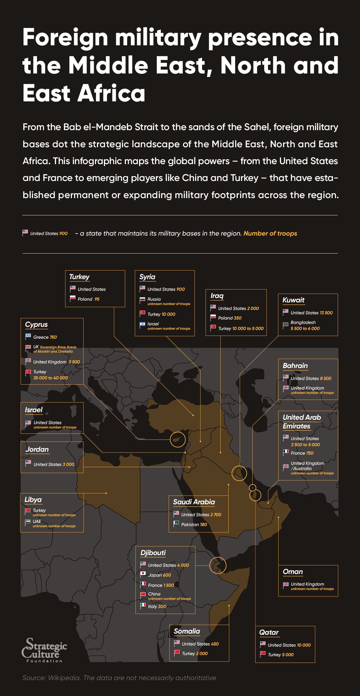 From the Bab el-Mandeb Strait to the sands of the Sahel, foreign military bases dot the strategic landscape of the Middle East, North and East Africa. This infographic maps the global powers - from the United States and France to emerging players like China and Turkey - that have established permanent or expanding military footprints across the region.