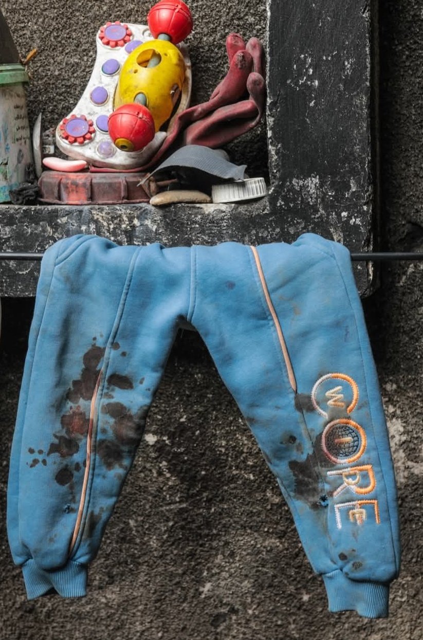 Mise à jour 24.03 : "Voici le pantalon de l'enfant Jawad Abu Nasser - un petit morceau de tissu qui constitue une preuve puissante du crime. Il porte des traces de son sang, témoignant des sévices qu'il a subis. On distingue également un trou visible, indiquant l'insertion d'un objet pointu, ressemblant à une tige métallique, dans son pied, avec un point de sortie clairement visible à travers le pied et le tissu. Les preuves ne s'arrêtent pas là ; il y a aussi des marques qui semblent être des brûlures, probablement causées par des cigarettes éteintes dessus. Le pantalon d'un enfant qui n'a même pas un an et demi... et pourtant, il raconte une histoire injustifiable." Source : Sameh Ahmed, sur X ex-Twitter.