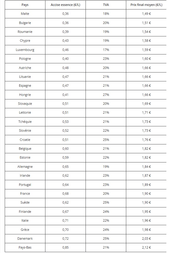Cela correspond à 0,36 € par litre pour l'essence et 0,33 € par litre pour le diesel. En comparaison, la taxe appliquée en France est d'environ 0,68 € par litre. La France taxe donc presque deux fois plus que le minimum européen.