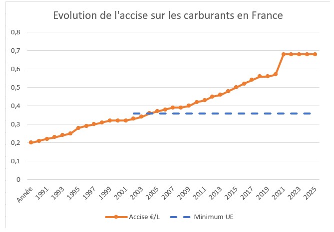 Depuis 2003, la fiscalité des carburants est encadrée par la directive européenne 2003/96/CE sur la taxation de l'énergie, qui fixe des niveaux minimums d'accise, mais chaque État est libre de taxer davantage.