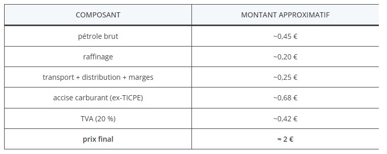 Ainsi, le coût réel du carburant et distribution est d'environ 0,90 € et les taxes ≈ 1,10 €. La fiscalité représente donc environ 55 à 60% du prix final.