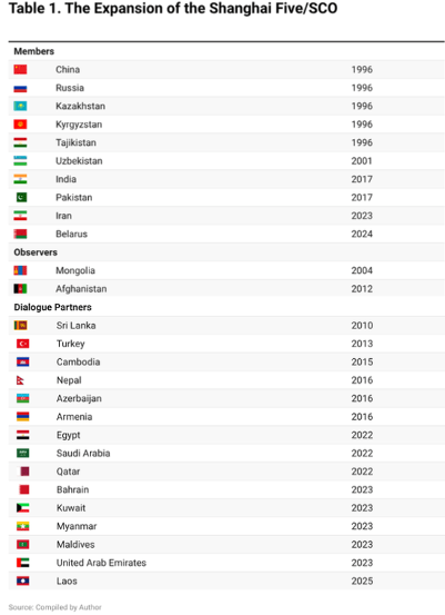 Cinq ans après la chute de l'Union soviétique, les dirigeants de la Chine, de la Russie et de trois des nouveaux États indépendants d'Asie centrale - le Kazakhstan, le Kirghizistan et le Tadjikistan - ont créé le Groupe de Shanghai. Son rôle principal était d'améliorer la sécurité collective de ces cinq États en luttant contre les "trois fléaux" : le séparatisme, le terrorisme et l'extrémisme. En 2001, l'Ouzbékistan est devenu le sixième membre et l'organisation a pris officiellement le nom d'OCS. La Mongolie a obtenu le statut d'observateur en 2004, suivie de l'Afghanistan en 2012. En 2008, l'OCS a lancé un appel à candidatures pour devenir partenaire de dialogue. En 2017, elle a accueilli ses premiers nouveaux membres depuis 2001, l'Inde et le Pakistan, suivis de l'Iran en 2023 et du Bélarus en 2024 (voir tableau 1).