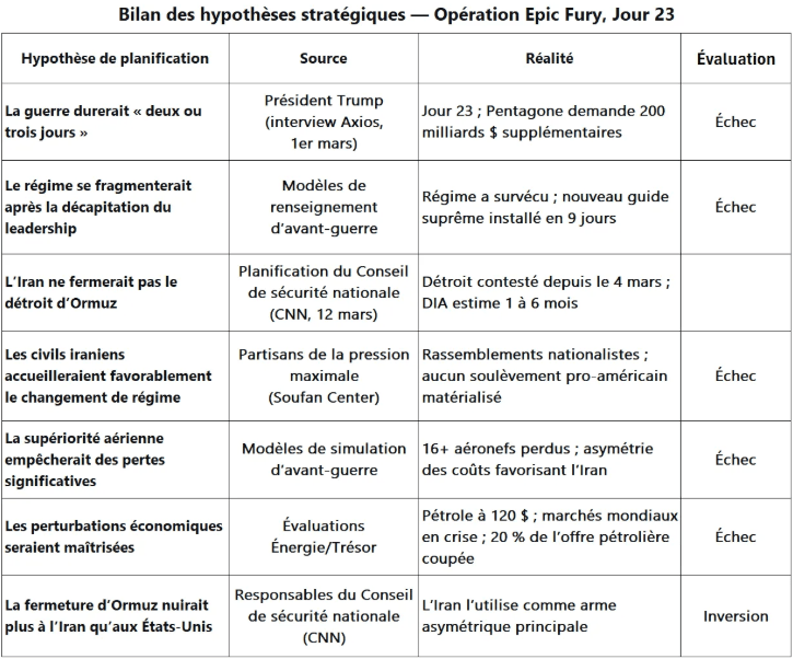 Le Soufan Center, CNN, Fortune et l'Atlantic Council ont tous documenté l'écart grandissant entre les hypothèses de planification d'avant-guerre et la réalité opérationnelle. L'évaluation suivante s'appuie sur leurs reportages, complétés par des déclarations du CENTCOM et des données économiques.