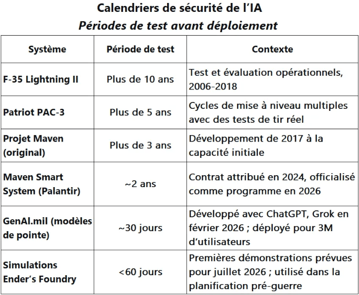 Les systèmes militaires traditionnels subissent des années de tests avant leur déploiement au combat - le F-35 a nécessité plus d'une décennie, le Patriot plusieurs cycles de mise à niveau sur des années, le projet Maven original trois ans pour atteindre une capacité initiale. La stratégie de Hegseth a radicalement compressé ces délais.  GenAl.mil s'est développé en février 2026 pour intégrer ChatGPT, Grok et Gemini pour trois millions d'utilisateurs militaires, le même mois où la guerre a commencé.