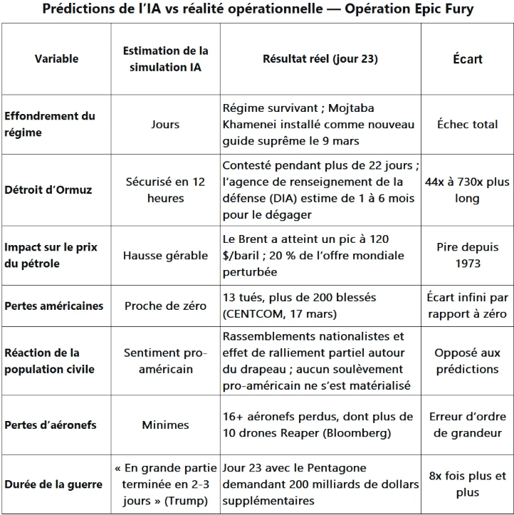 Ainsi, la combinaison de ces trois facteurs a conduit à sept hypothèses stratégiques erronées (durée de la guerre, réaction du régime, fermeture du détroit d'Ormuz...), qui ont échoué en 23 jours alors que la guerre en Iran contredisait chaque prédiction de l'IA.