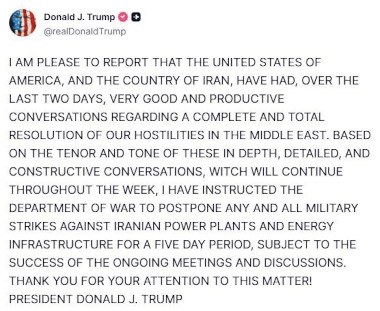 J'ai le plaisir de vous annoncer que les États-Unis et l'Iran ont eu, au cours des deux derniers jours, des conversations très bonnes et productives au sujet d'une résolution complète et totale des hostilités au Moyen-Orient. Sur la base de ces conversations profondes et constructives, qui continueront durant la semaine, j'ai demandé au Département d'État de reporter de cinq jours les attaques militaires contre l'infrastructure énergétique iranienne, en fonction du succès des discussions en cours. Merci de votre attention. Président Donald J. Trump