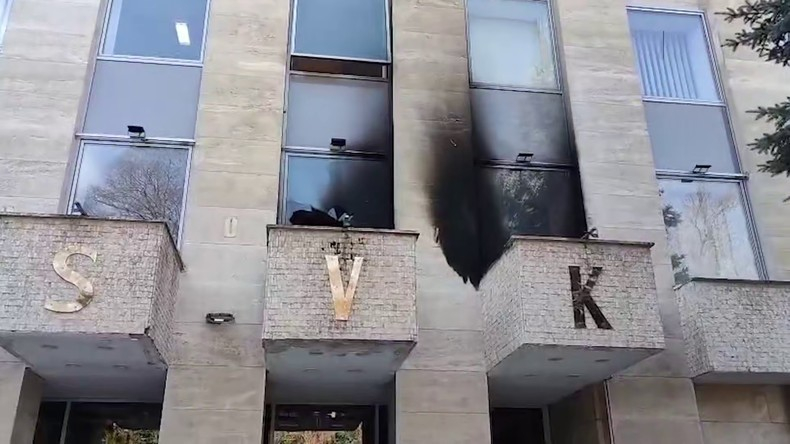 Façade de la Maison de la Russie à Prague après l'attaque aux cocktails Molotov