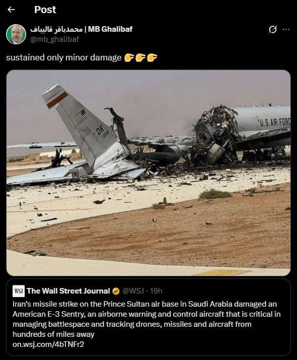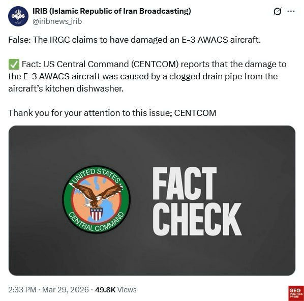 Après une mise en bouche du président du parlement iranien qui ironise sur les "dégâts mineurs" subis par un coûteux avion radar awacs américain E3 Sentry sur la base militaire saoudienne de Prince Sultan, c'est au tour du CENTCOM (virtuel iranien) de démentir les prétentions de Téhéran : c'est en effet la canalisation bouchée du lave-vaisselle de la kitchenette de l'avion qui serait à l'origine de ces dégâts...