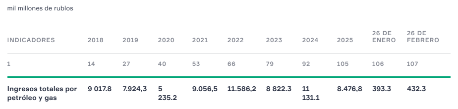 - Como dato adicional, pero no sistematizado, se estima que por venta de petróleo ruso al mundo en el marco de la guerra en Irán y las restricciones a la circulación de cargueros en el Estrecho de Ormuz y posiblemente en el Mar Rojo próximamente, Rusia ha recibido cerca de 150 millones de dólares diarios adicionales. En ese sentido los valores de marzo de 2026, no cuantificados aún, es posible que se vean aumentados, pues Rusia, que vendía sin descuento a 55 USD y ahora vende a 90 USD) sus hidrocarburos tras la propia venia del gobierno estadounidense a varios países e incluso gas ha debido comprarle Europa a regañadientes.