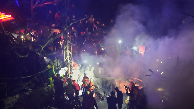 Des pompiers et des secouristes inspectent le site des frappes aériennes israéliennes, à Beyrouth, au Liban, le 1er avril 2026.