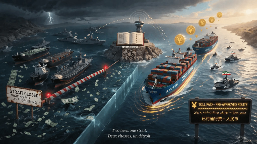 La route maritime la plus importante du monde fonctionne désormais selon un système à deux vitesses. Si vous êtes chinois, russe, indien, pakistanais ou malaisien, vous soumettez vos documents à un intermédiaire lié au CGRI, vous payez entre 0,50 et 1,20 dollar par baril de cargaison via des comptes à la Kunlun Bank - l'institution chinoise qui traite depuis des années les transactions contournant les sanctions contre l'Iran -, vous recevez un code d'autorisation, des instructions d'acheminement et un bateau-pilote qui vous escorte au large de l'île de Larak. Si vous êtes usaméricain, britannique, européen ou allié de l'un de ces pays, vous n'obtenez rien. Vos pétroliers restent à l'ancre avec 2000 autres navires et 20 000 marins bloqués, en attendant que l'Iran rouvre le détroit - ce qu'il n'a pas l'intention de faire selon les anciennes règles.