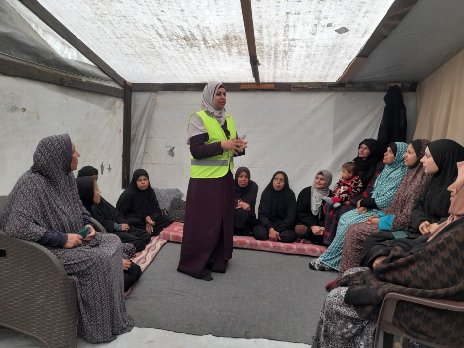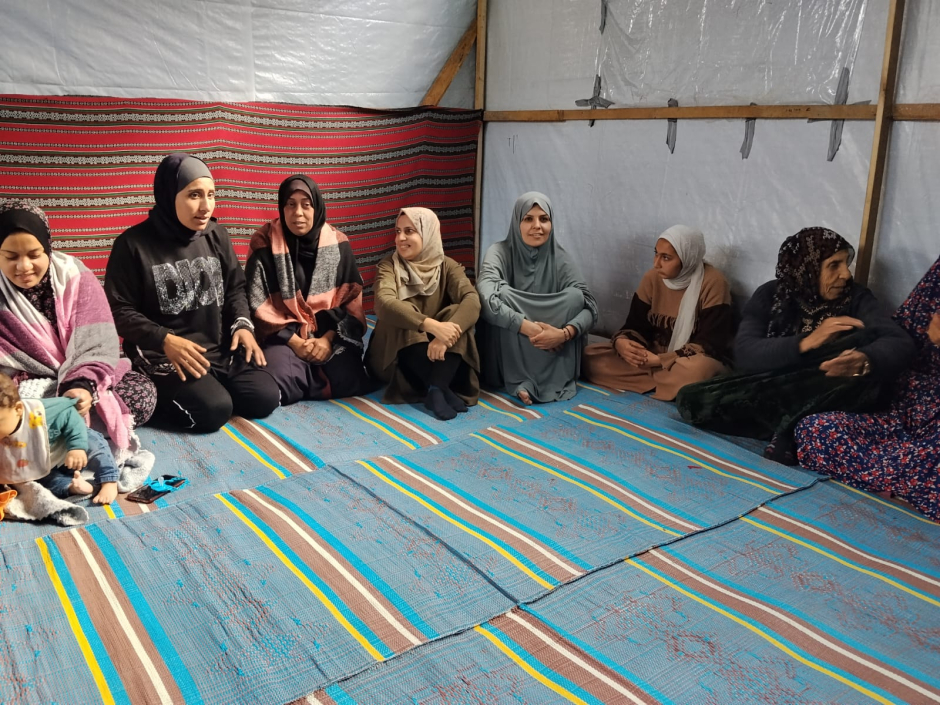 Dans ce cadre a été organisée la séance : Ensemble, nous surmontons les difficulté, le réseau de sécurité, mise en œuvre par l'équipe UJFP dans le camp d'Al-Israa, à l'ouest de Gaza, avec la participation de 25 femmes déplacées. Cette rencontre a ouvert un véritable espace de dialogue sur la manière de transformer cette proximité contrainte en source de force plutôt qu'en facteur de pression supplémentaire.