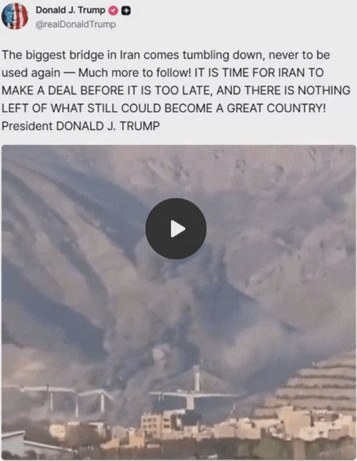 Pendant cette catastrophe qui se poursuit, Trump a continué à proférer avec détachement des menaces contre les infrastructures civiles iraniennes :