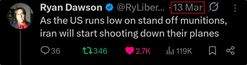 Une fois de plus, notre analyse se confirme : l'Iran ne subit pas d'attrition aussi drastique que ce qui est affirmé. Le taux d'attrition réel de ses systèmes de missiles est probablement inférieur à 10%, car les États-Unis ne touchent que très peu de cibles stratégiques. L'Iran a su les stocker judicieusement pour traverser la brève période de tensions entre les États-Unis et ses munitions, jusqu'à épuisement de ces dernières.
