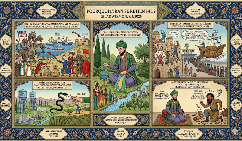 • L'État juif s'est révélé à la fois génocidaire et suicidaire. Cette combinaison de caractéristiques en fait un élément très dangereux avec lequel composer. Si j'ai raison, l'Iran choisit alors de briser lentement l'esprit israélien. Plus tôt aujourd'hui, j'ai entendu un Israélien sur la chaîne N12 dire : "Une fois qu'ils rouvriront l'aéroport Ben Gourion, tout le monde partira. Personne ne restera pour éteindre la lumière". C'est, évidemment, une exagération ; cependant, beaucoup feront prudemment tout ce qu'ils peuvent pour quitter cet asile de fous.