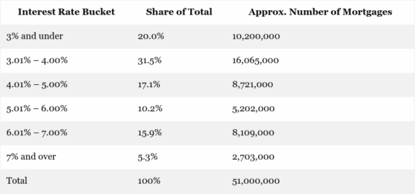 So as a practical matter, no one is going to see nominal 30-year mortgage rates below 5.0% any time soon. What that means is that there are now more than 10 million mortgages locked-in at deeply below market rates of 3.0% or under, while upwards of 25 million or nearly half of all home mortgages outstanding carry rates under 5.0%