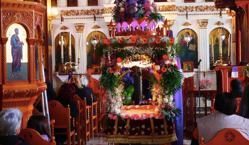Vendredi Saint. On a déjà préparé l'Epitáphios. Le Christ est mort. Partout en Grèce comme ailleurs dans le monde des Orthodoxes on expose son icône ou plus exactement son linceul, grand tissu brodé, luxueusement orné.
