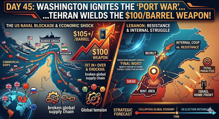 Nous sommes ce soir au bord d'une transformation dans le monde. Ce qui a commencé comme une guerre régionale pour briser l'Axe s'est officiellement transformé aujourd'hui en une crise économique globale sans précédent. Avec l'entrée en vigueur du "blocus naval" américain total sur les ports iraniens, l'administration Trump a choisi le suicide économique après l'échec militaire. Pendant ce temps, au Liban, tous les regards sont tournés vers la prochaine intervention du secrétaire général du Hezbollah, le cheikh Naim Qassem. Il ne s'agira pas d'un simple appel au rassemblement, mais plutôt d'un "document de changement de cap" rigoureux qui vise à dissuader les autorités politiques d'offrir des concessions injustifiées et à dénoncer la mascarade des "négociations directes".