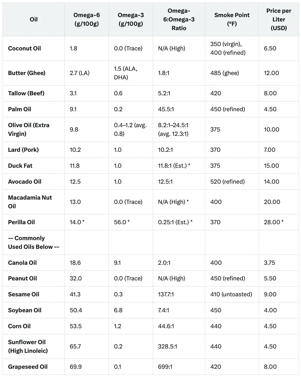 As such, I've put a lot of thought into which oils could replace the high omega 6 oils we routinely use (e.g., soy oil). If we look at it from a standpoint of omega 6 content and omega 3 content, the following options exist: