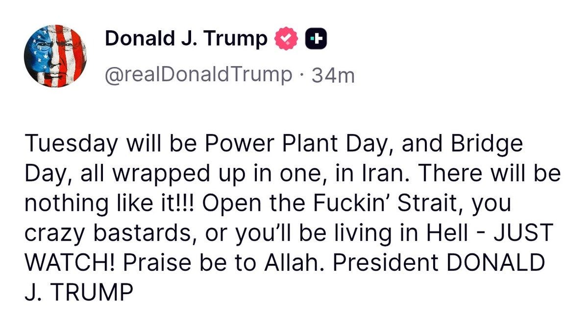 Trump's military debacle and his complete inability to reopen the Strait of Hormuz obviously filled him with towering rage. He'd posted his crude, profanity-laced promise to destroy most of Iran's civilian infrastructure on Easter Sunday morning, and this immediately provoked a fire-storm of controversy.