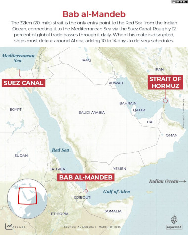 L'Arabie saoudite avait contourné l'imposition du contrôle du trafic à travers le détroit d'Hormuz par l'Iran en réacheminant le pétrole par son oléoduc est-ouest vers Yanbu dans la mer Rouge. Quelque 4 à 5 millions de barils par jour en sont exportés. La fermeture de la mer Rouge à son ouverture sud bloquera la majeure partie de ce trafic.