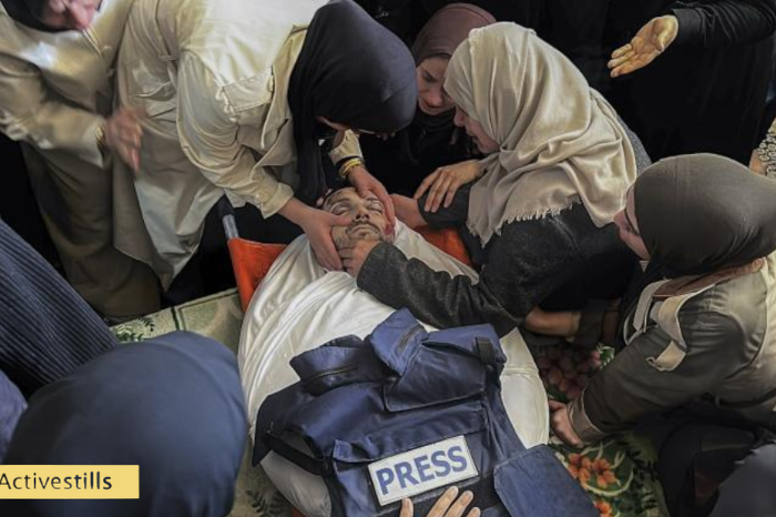 9 avril 2026 - La famille de Mohammed Washa, correspondant d'Al Jazeera Mubasher, a fait ses adieux à leur proche à leur domicile dans le camp de réfugiés d'Al Bureij, dans la bande de Gaza, après qu'il eut été tué lors d'une frappe israélienne par drone contre sa voiture. Depuis le lancement de sa guerre génocidaire contre les Palestiniens de Gaza en octobre 2023, Israël a tué un nombre sans précédent de journalistes dans la bande de Gaza - au moins 262 journalistes selon le Bureau des médias du gouvernement de Gaza. Le 28 mars, Israël a également tué trois journalistes dans le sud du Liban lors de son invasion militaire - Photo : Doaa Albaz / Activestills