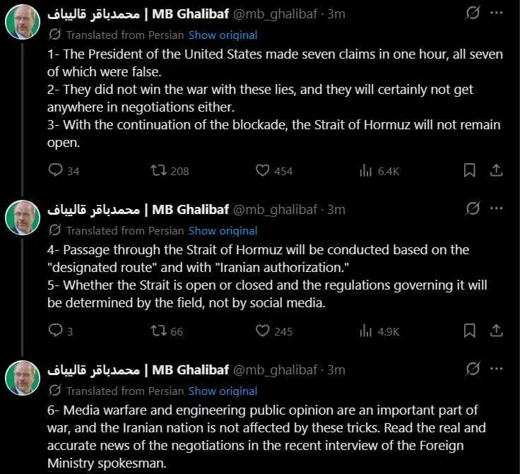 On Friday, April 17, 2026, President Donald Trump posted a flurry of optimistic messages on Truth Social (and referenced in interviews) framing the US-Iran war as largely over or nearing a swift resolution. His claims centered on the reopening of the Strait of Hormuz, progress toward a broader peace deal, and US leverage. Most of what Trump wrote was forcefully denied by Iran (see image above). Here is a summary of the various claims he made on Friday: