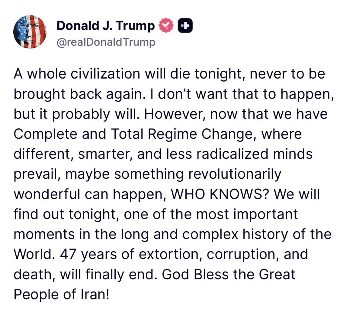 So on Easter Sunday morning, he reacted with volcanic fury, promising to destroy all of Iran's civilian infrastructure unless the strait were reopened. He then followed it up on Tuesday morning with an even more outrageous threat to annihilate all of Iranian civilization.