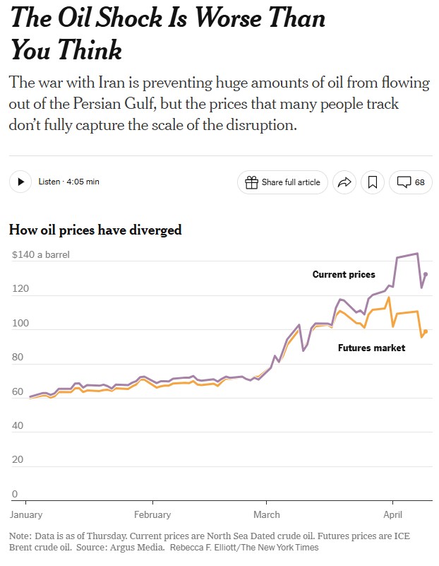 Perhaps I'm being overly conspiratorial, but many Zionist billionaires are determined to continue the war and they have a powerful incentive to temporarily mask the terrible economic consequences of the Iranian blockade of the Strait of Hormuz. So I wonder if they aren't manipulating the widely-quoted futures market prices, which might otherwise have already panicked Wall Street and forced Trump to end the conflict.