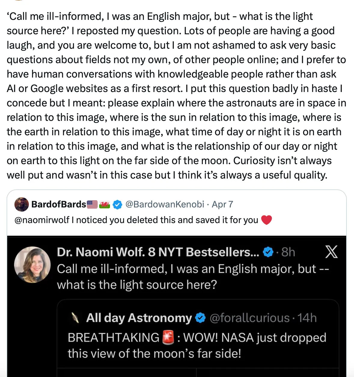 Many of those online who trolled my "stupid question", mocked me for not having first "asked Grok" about light on the moon.