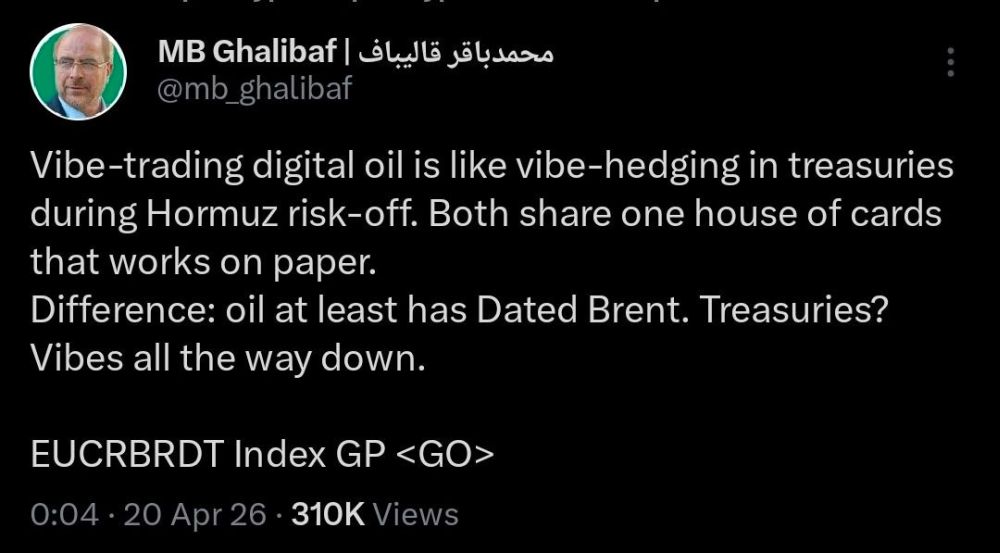 Why, just again on April 19th, three minutes after futures opened, Iranian House Speaker Ghalibaf confirmed, for the umpteenth time, that Iran is using insider information on the US-Israel vs. Iran conflict to generate revenue for the Islamic Republic. That means the course of things is obvious enough to see. There is a gravity to the situation. Realism. Coordination between the Iranians and team Trump is done through signals, things better left unsaid, (but nevertheless communicated); reading the situation, a type of geopolitical telepathy.