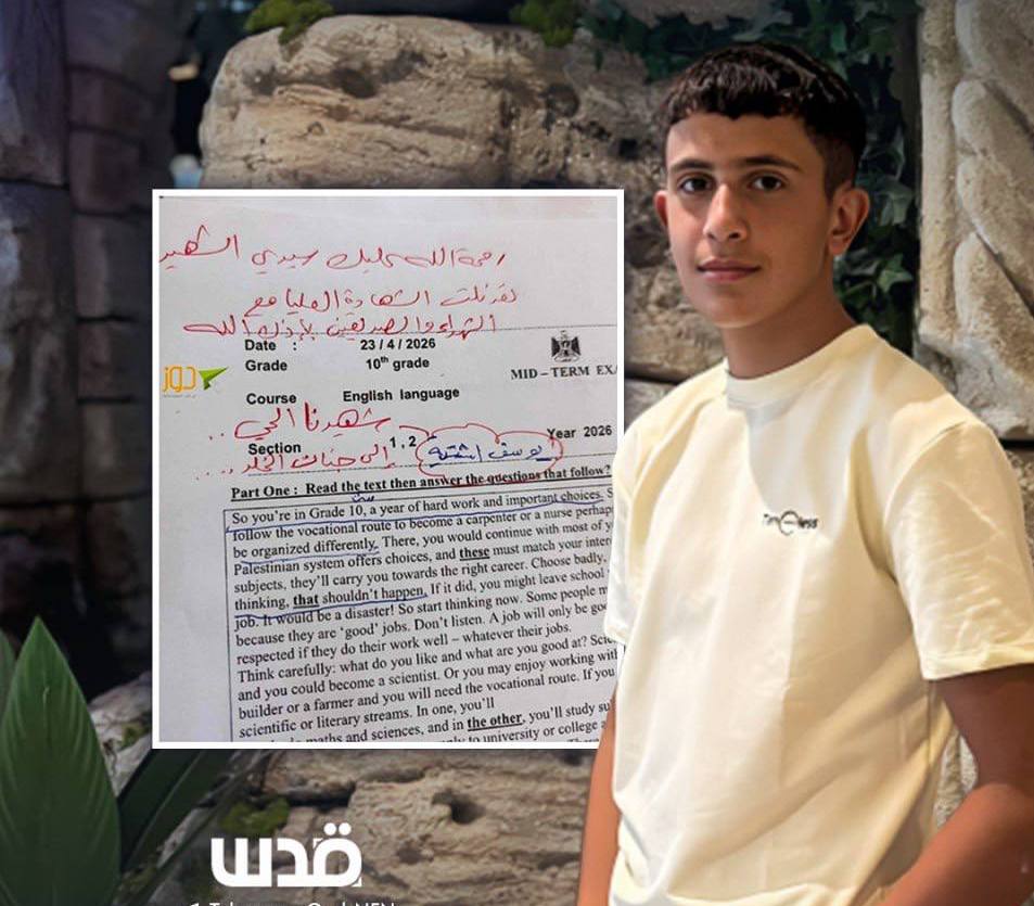 Ahmed Atallah, un professeur palestinien, partage une photo de la copie d'examen d'anglais de son élève, Yusuf Ashtiyeh, tué alors qu'il quittait son école lors d'un raid sur la ville de Naplouse, en Cisjordanie occupée.