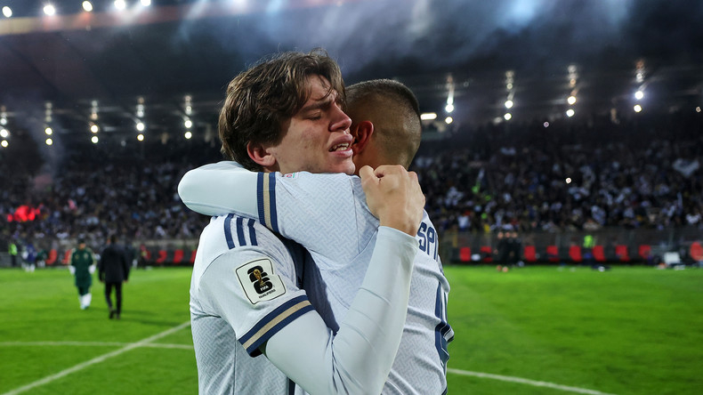 Les Italiens Marco Palestra et Leonardo Spinazzola après la défaite face à la Bosnie en barrage, le 31 mars 2026.