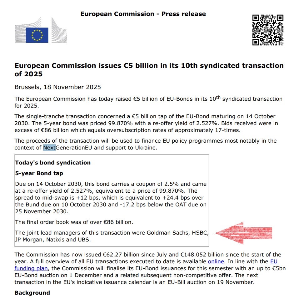 HSBC, Goldman Sachs International, J.P. Morgan, and Barclays, all with significant London operations, acted as joint lead managers on EU syndicated bonds in connection with the then unprecedented NextGenerationEU which we can see here also funds their war in Ukraine, and the case of the €90 billion scheme, is entirely based on the above model and precedent. These banks are incentivized to prolong the conflict between Ukraine and Russia: ongoing instability ensures sustained demand for bonds, derivatives, and advisory services. But of course it's deeper, as we have explained: the EU's political institutions are mere facilitators, providing legitimacy while City of London actors extract profits and also soften up European markets, making this also a geopolitical gambit where the UK is acting with malice towards the EU member states and their citizens, though in apparent collusion with the EU Commission and the "Eureaucracy" at large.