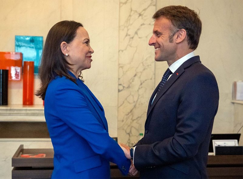 La leader d'extrême droite María Corina Machado reçue par Marco Rubio et Emmanuel Macron (DR) Trump, pour l'heure (et jusqu'à ce qu'il change d'avis !), ne parle pas d'élections. L'opposition en exige l'organisation, sous peine de... « crise institutionnelle »  ! S'agissant des procédures à appliquer en cas d'absence du chef de l'Etat, la Constitution envisage deux cas de figures : « absence temporaire » ou » absence définitive ». « Si une absence temporaire se prolonge au-delà de deux périodes de quatre vingt dix jours consécutives, l'Assemblée nationale doit décider à la majorité de ses membres s'il y a lieu de considérer qu'il s'agit d'une absence définitive » (article 234). En cas d'absence définitive survenue durant les quatre premières années du mandat, « des élections doivent être convoquées dans les trente jours » (article 233).Mouvement de Machado, Vente Venezuela rend public un communiqué exigeant l'organisation d'élections en raison de l'absence absolue « du président Maduro ». Eclat de rire général - malgré la tension. Les radicaux viennent explicitement de reconnaître le chef de l'Etat ! Ils ont oublié le malheureux Edmundo González, qu'ils ont proclamé vainqueur de l'élection du 28 juillet 2024 en vertu d'un comptage parallèle dénué d'une quelconque légitimité. Trump, d'ailleurs, a fait de même, en reconnaissant comme présidente intérimaire celle qui fut (et est toujours) la vice-présidente de l'« illégitime » Maduro.