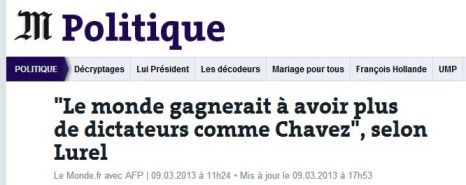 Il était une fois un ministre qui, le vendredi 8 mars 2013, interrogé par Europe 1 à l'occasion des obsèques d'Hugo Chavez crut bon de déclarer : « Moi je dis, et ça pourra m'être reproché, [...] que le monde gagnerait à avoir beaucoup de dictateurs comme Hugo Chavez puisqu'on prétend que c'est un dictateur. Il a pendant ces 14 ans respecté les droits de l'Homme. »