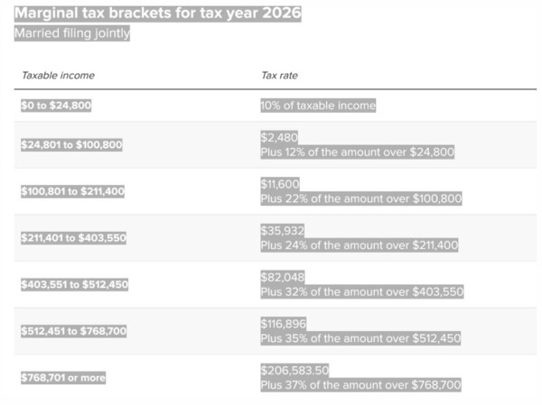 That household would have $52,800 of taxable income after the standard deduction of $32,200 and would owe 10% on the first $24,800 of taxable income and a 12% marginal rate on the balance, thereby generating an income tax liability of $5,840 or just under 7% of gross income.