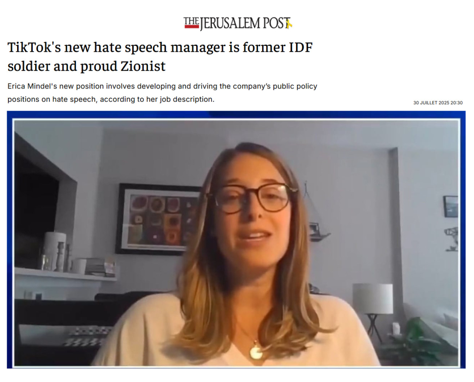 The Jerusalem Post : Erica Mindel, instructrice de l'armée israélienne et autoproclamée « sioniste passionnée », embauchée comme responsable des discours de haine au sein de TikTok